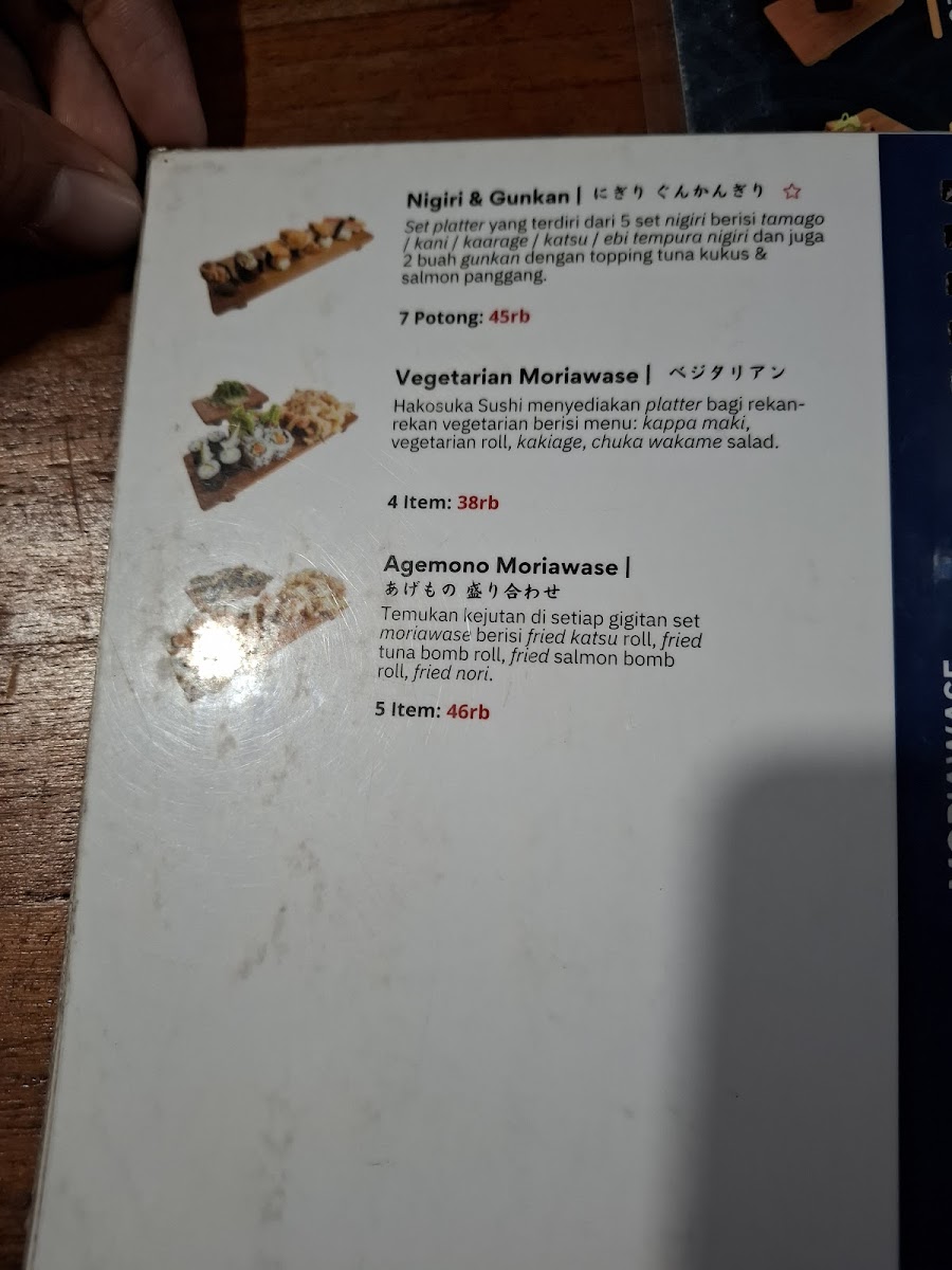 From a reviewer’s perspective, the menu at Hakosuka Sushi offers a satisfying mix of classic Japanese favorites and shareable platters that make it easy to explore a variety of flavors in one visit. The Salmon Canape stands out as a light yet flavorful starter, combining fresh salmon with a balanced bite-sized presentation that works well as an appetizer. For those who enjoy fried dishes, the Agemono Moriawase is a great choice, offering a selection of crispy items that add texture and variety to the meal. Meanwhile, the Paket Sushi 4 Porsi Lupa Namanya is ideal for groups, featuring an assortment of sushi that showcases different ingredients and preparation styles, making it both convenient and enjoyable for sharing. Overall, the menu feels well-rounded, with options that cater to both casual diners and sushi lovers looking for a filling and varied meal.